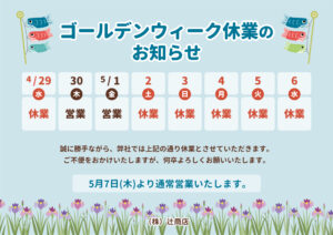 今年もゴールデンウィークは暦どおり土日祝日を休業とさせていただきます。